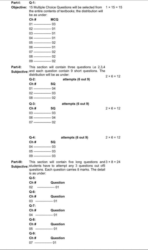 While the syllabus content is reduced (Smart Syllabus), the general paper pattern (MCQs, Short Questions, Long Questions) for the 1st Year Computer Science annual exams is expected to remain consistent with the official pairing scheme released by the Punjab Boards. However, the questions will strictly avoid the excluded topics. We recommend checking the official 2025-26 pairing scheme update for the final structure.