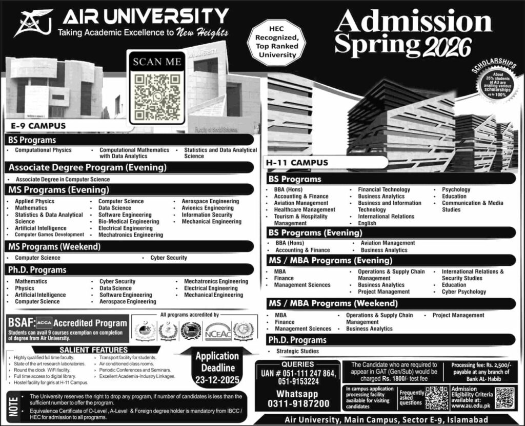 The **Admissions Spring 2026** for **Air University, Islamabad** presents a golden opportunity to pursue a high-quality, HEC-recognized education. From the established E-9 Campus to the expansive H-11 Campus, the university offers excellent programs across major disciplines. We have covered the critical **23 December, 2025** deadline, detailed the fee structure, and provided all the necessary official links. The key to securing your admission lies in timely application and diligent preparation for the entrance test.